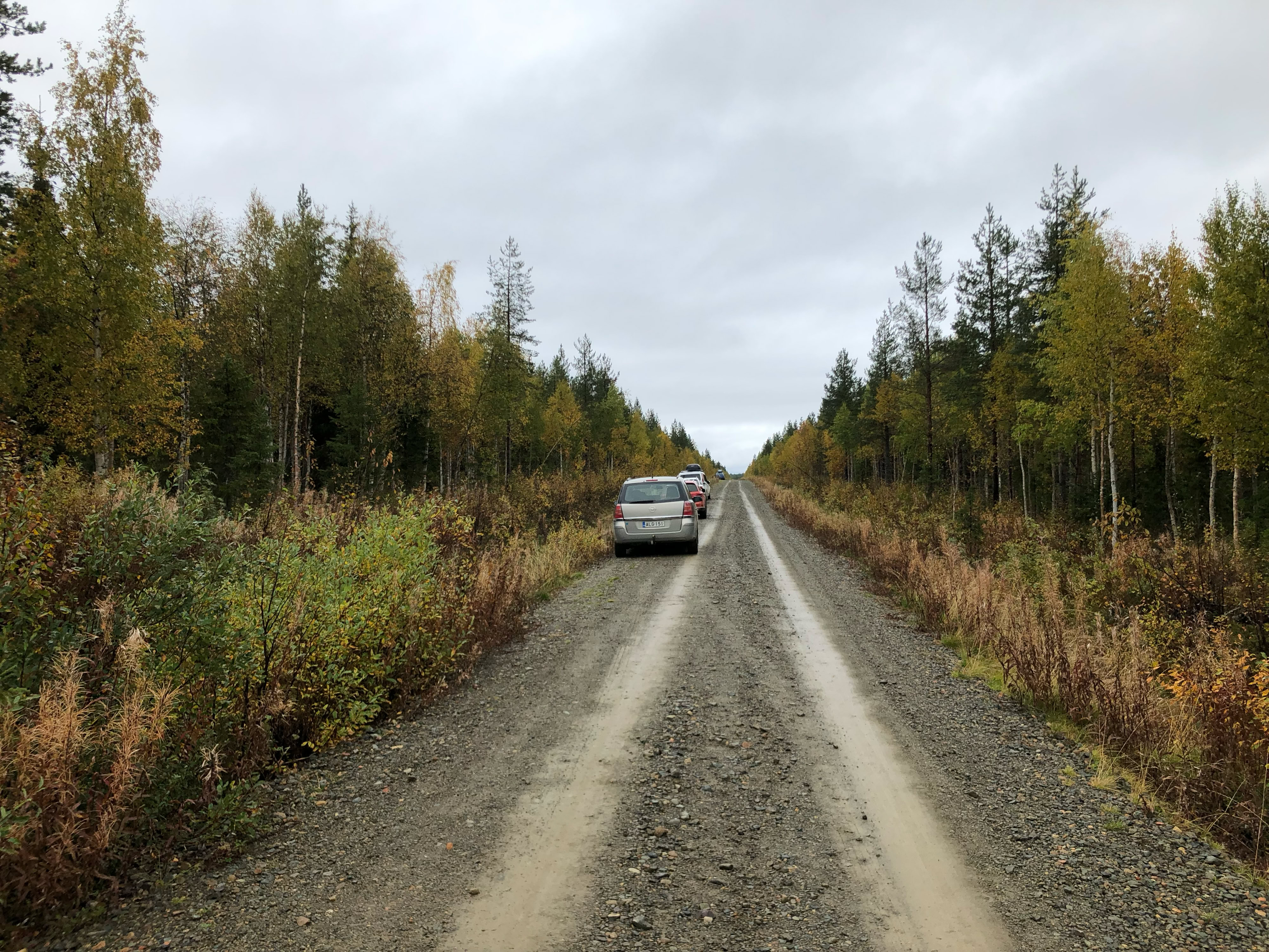 Tuolla tiellä kohtasimme pienen säikäytyksen, kun muutama kilometri ennen määränpäätä kohtasimme tiellä aidan ja portin. Kyse oli poroaidasta, josta sai ajaa eteenpäin, kunhan huolehti portin takaisin kiinni.