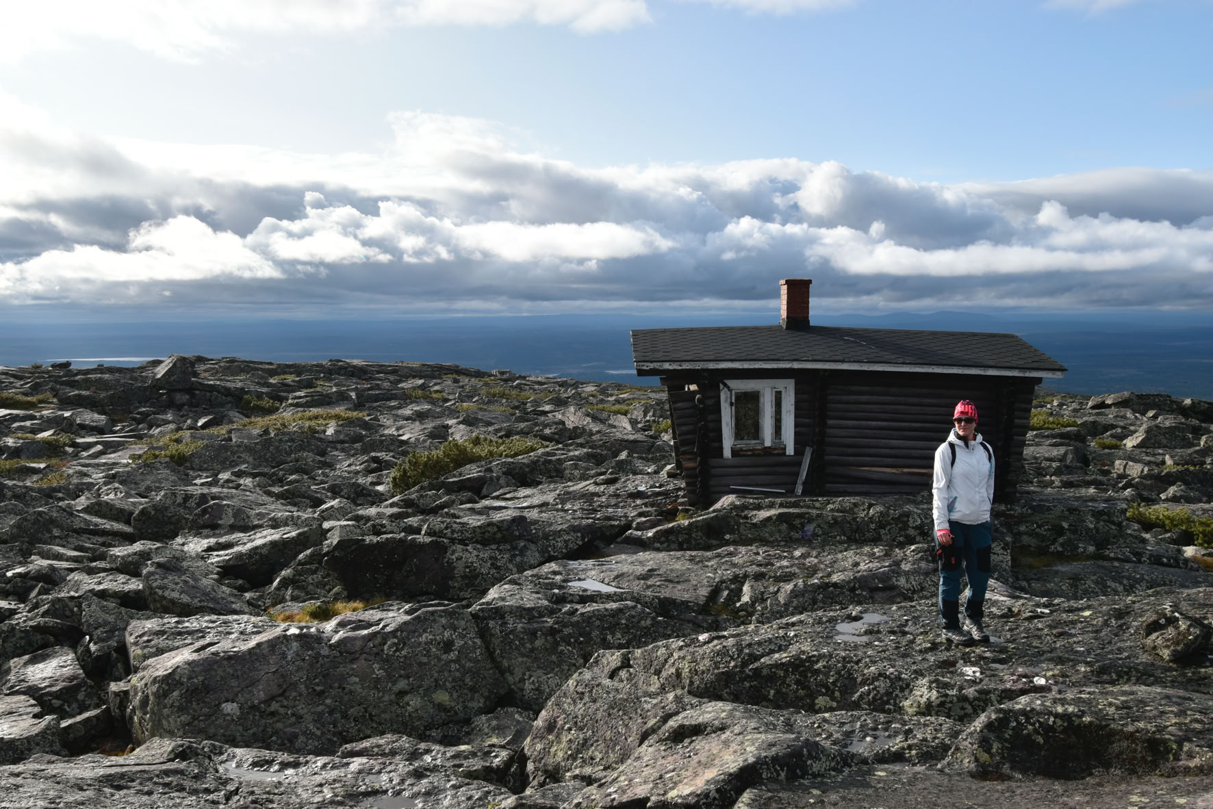 Sieltä se huippu ilmestyi lopuksi näkyville palovartijan majan kera. Kuten kuvasta näkyy, pienoinen matka huipulle kasvillisuuden loputtua oli rakkakivikkoista.