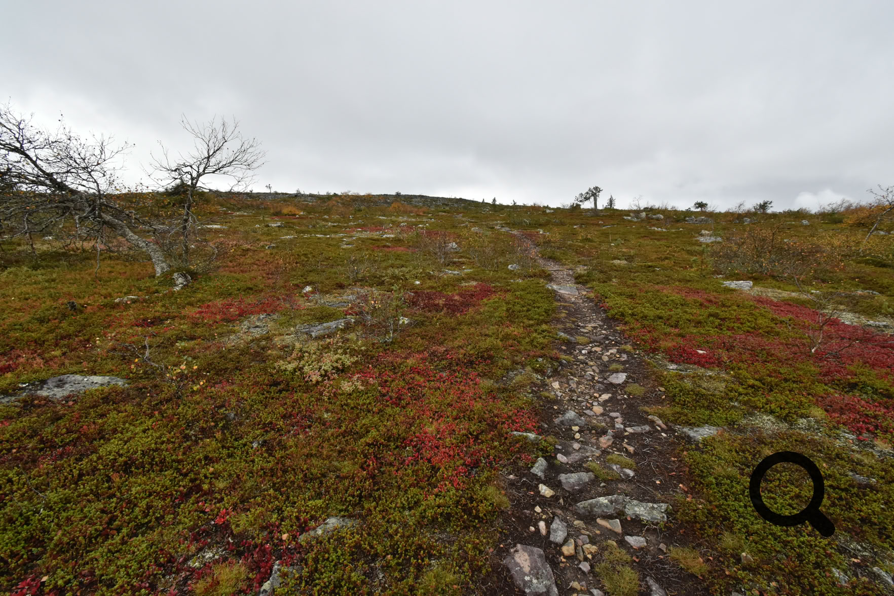 Palkaskurun loppupäässä huomasimme polun, joka lähti viemään vasemmalle huipun suuntaan. Olin varma suunnasta ja niin lähdimme extempore sille paljon pienemmälle polulle. Tuota reittiä oikaisisimme terävän mutkan kulman poikki virallisemmalta reitiltä, joka veisi tuolta Palkaskurun kodalta Kumputunturin laelle.