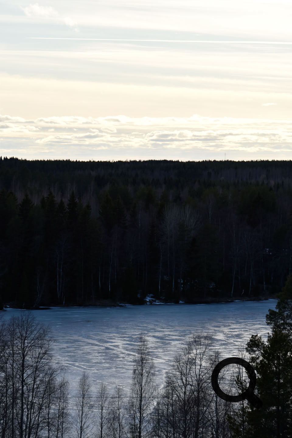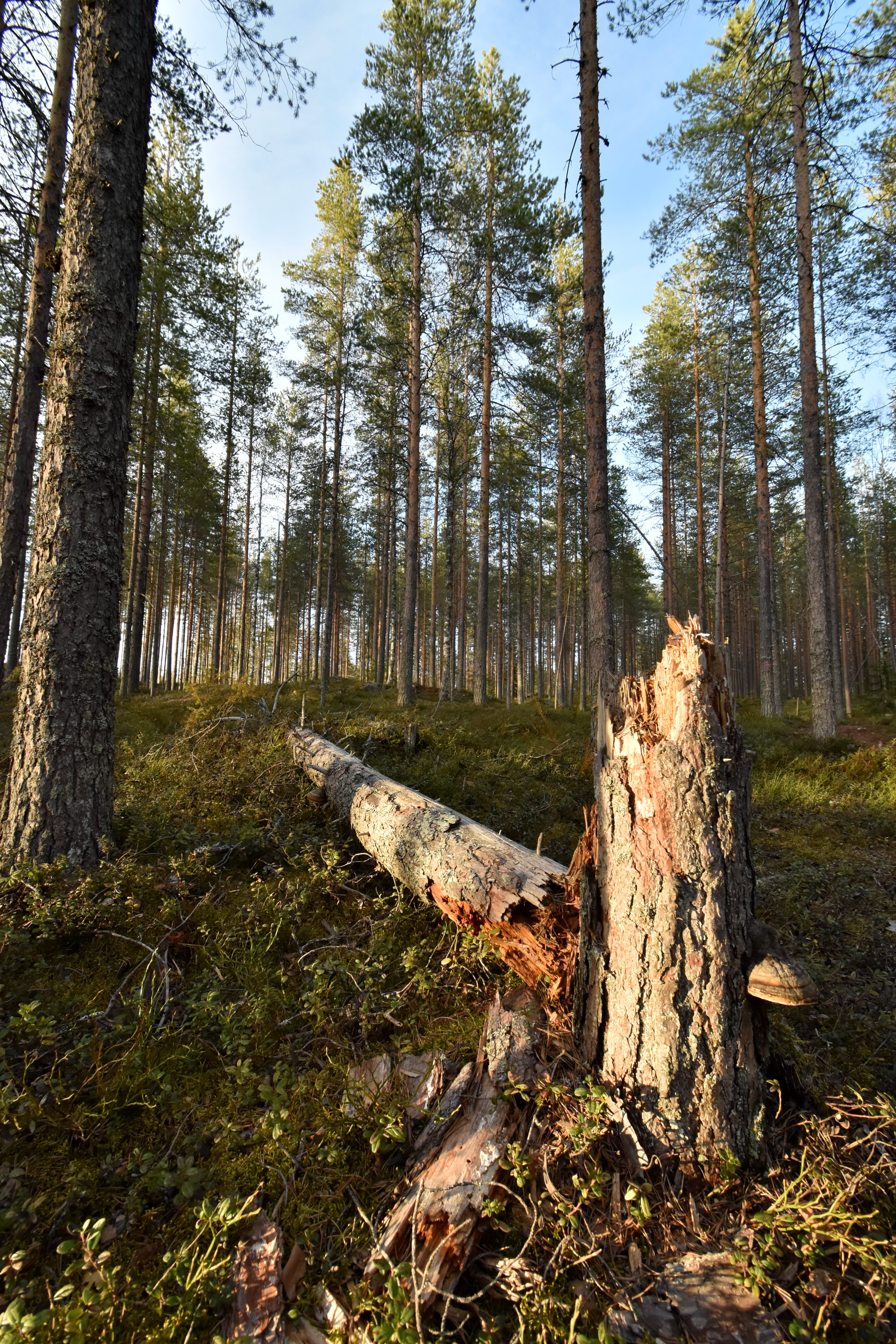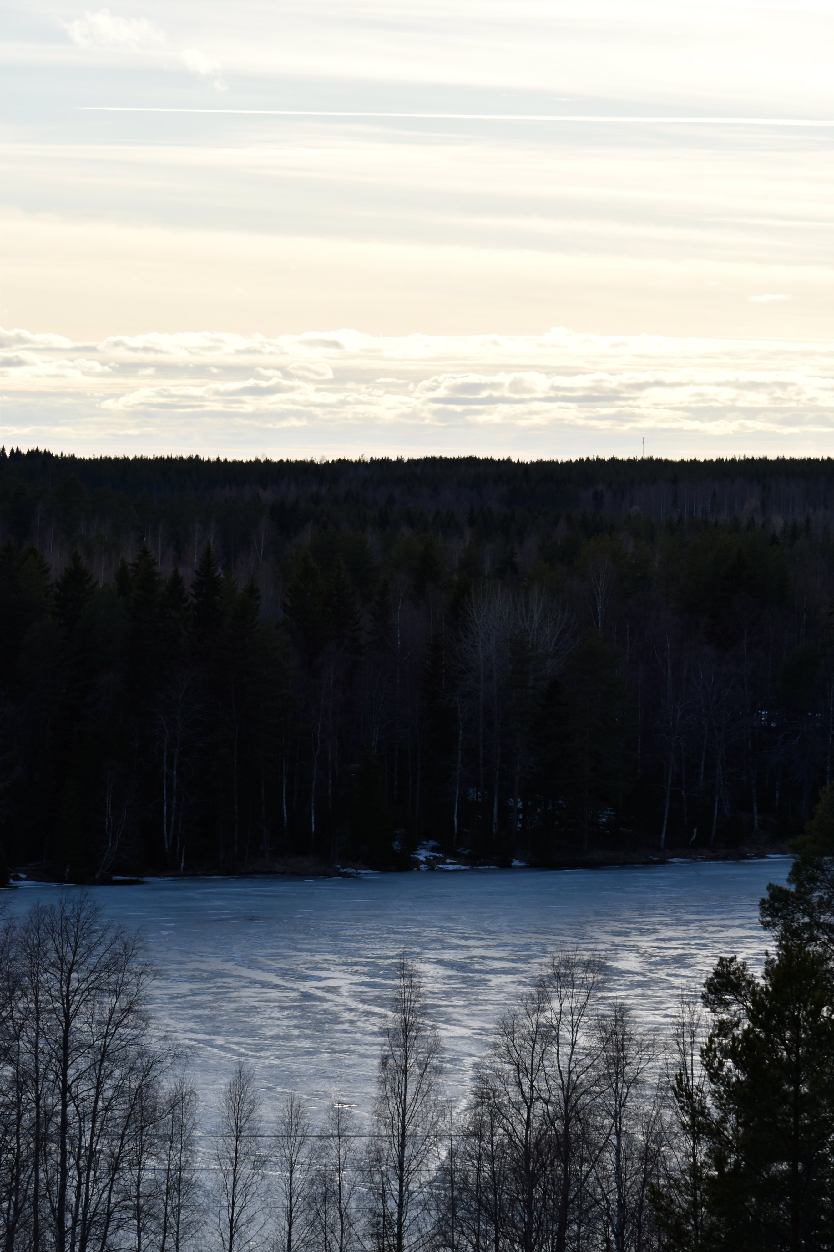 Alla myös haastava tilanne. Kirkas taivas ja tumma metsä, mutta myös taivaan valon ansiosta yksityiskohtia paljastava Vimpelinlammen jää. Ei mikään onnistunein yhtälö. Muita bongauksiani olivat myös Iisalmesta Kajaaniin saapuva juna, hauskasti jäkälöitynyt kivi ja kaatunut puu, jonka kannossa kääpä. Auringonlaskun valossa mukavan näköinen kohde. Oli siellä yksi harmahtava partainen ukkelikin…