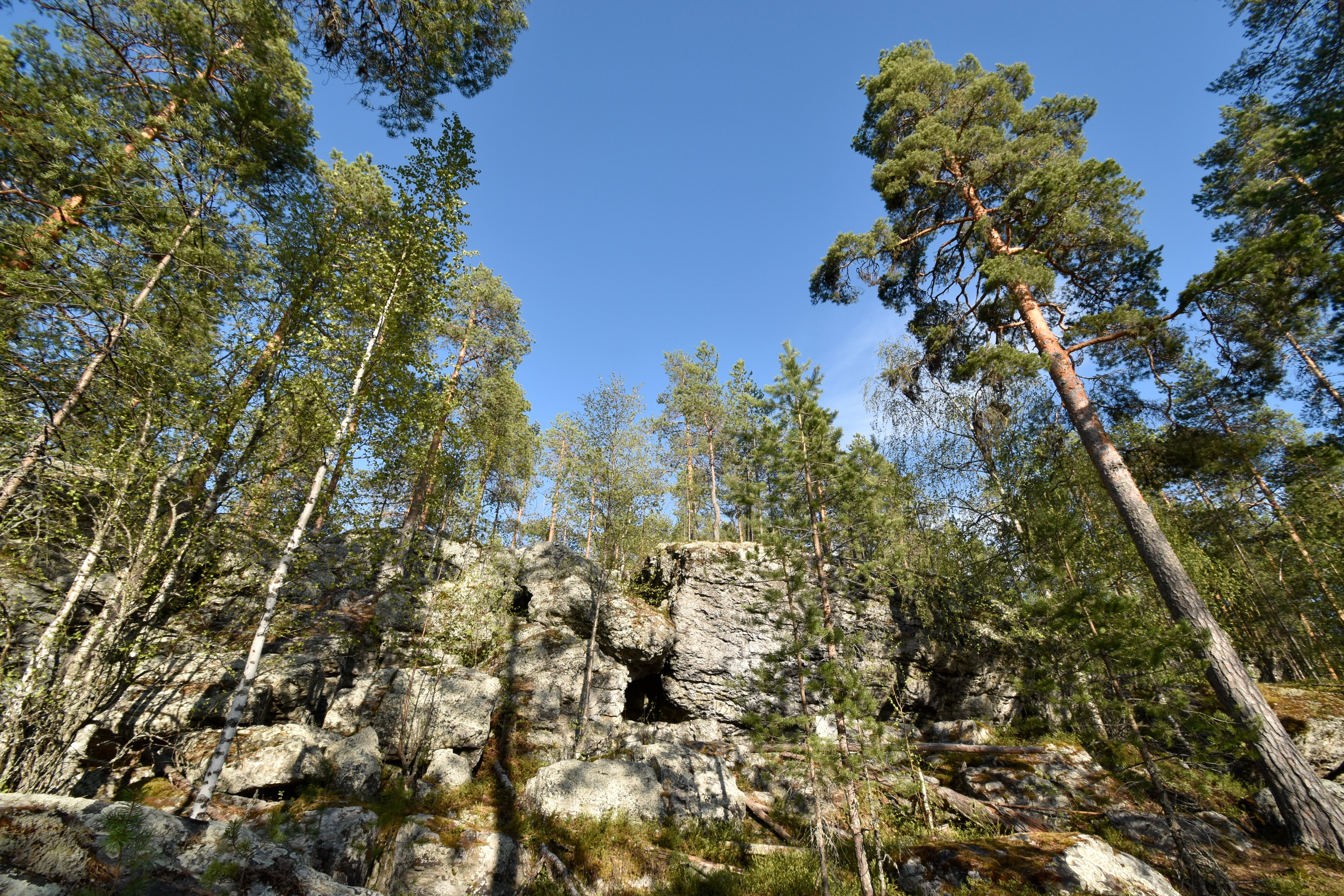 Tutkimassa lähitienoolta löytyvää luontokohdetta. Jyrkänteitä, luolia ja komeaa Kainuun luontoa.