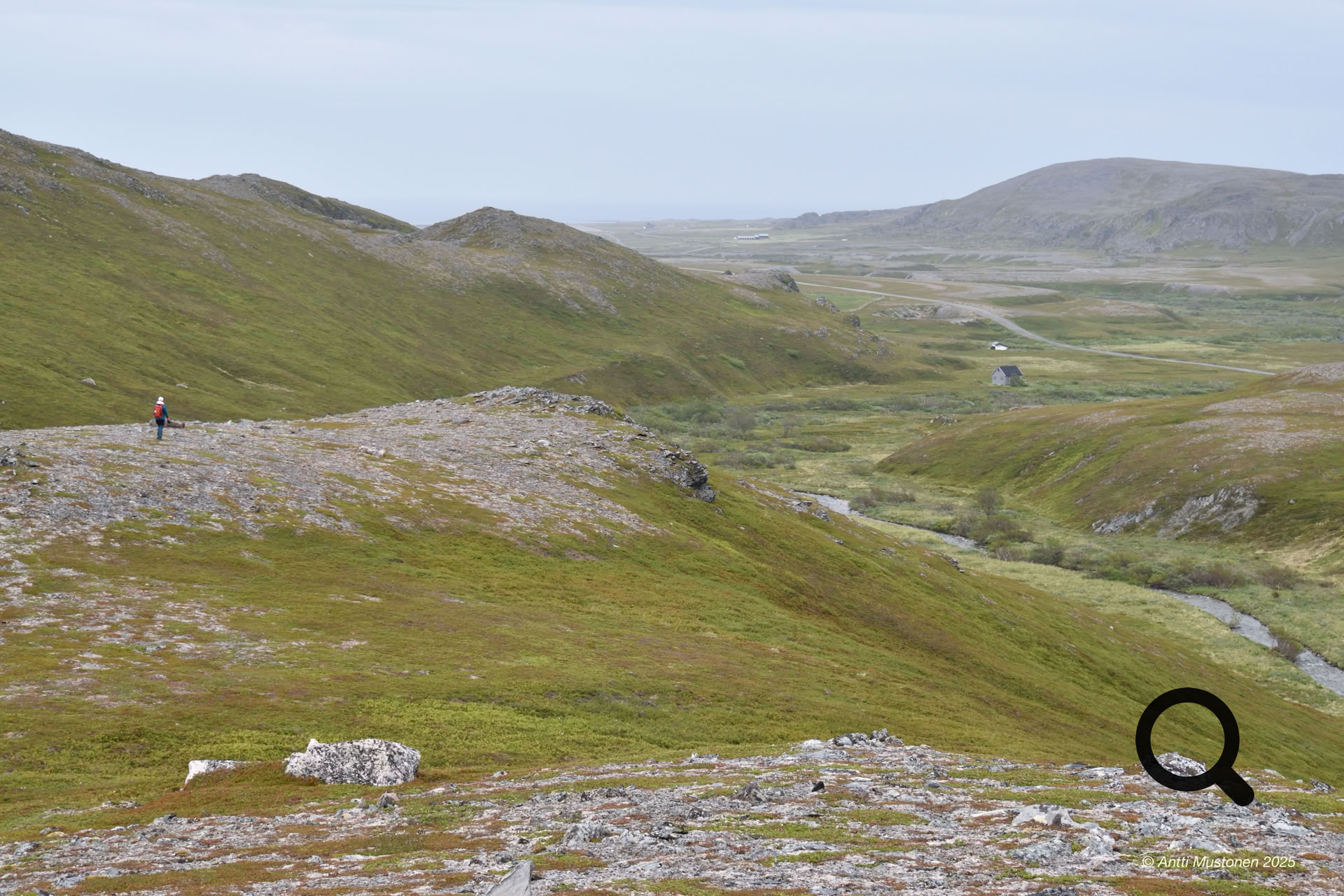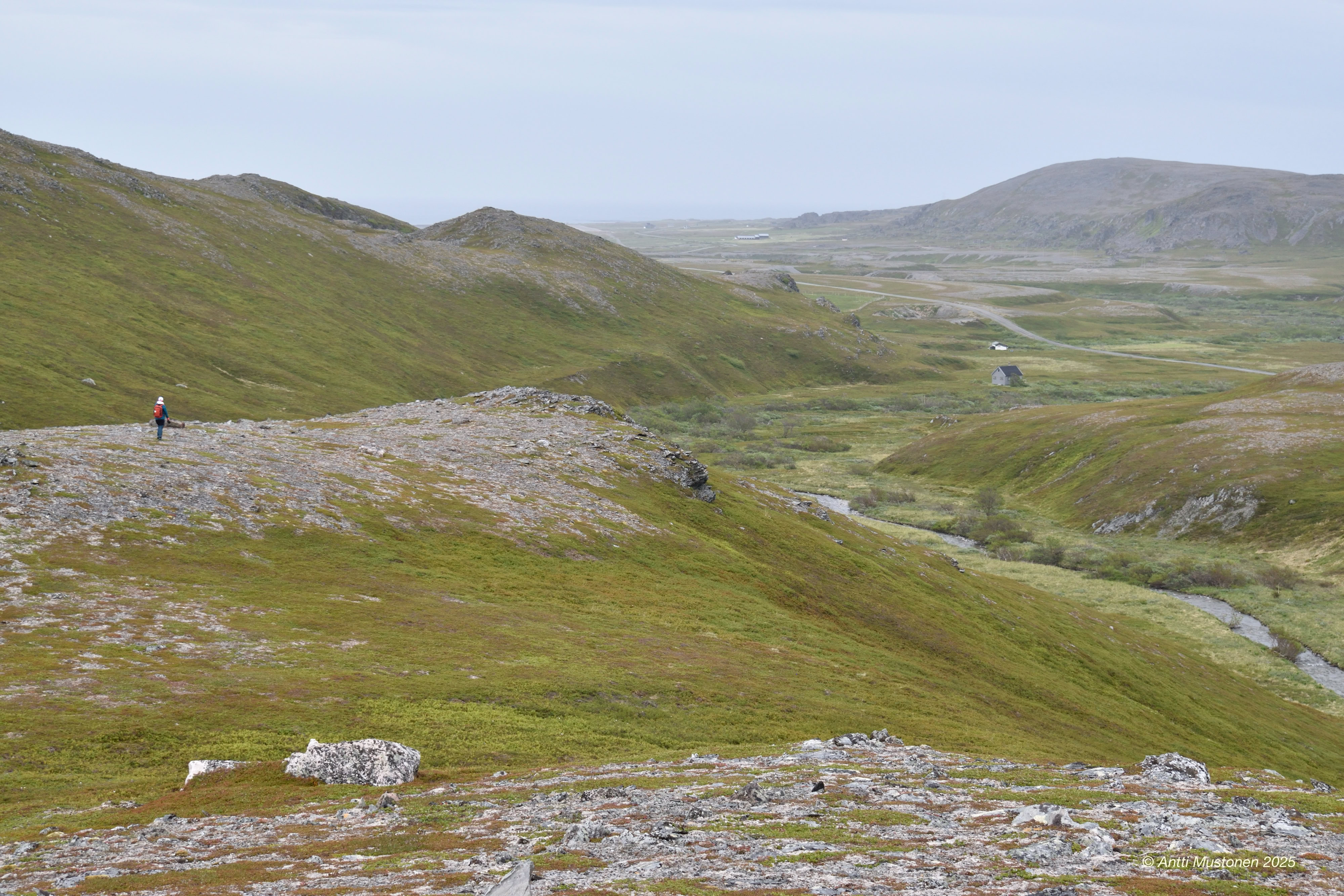 Nousimme vielä yhden kivihuippuisen mäen päälle lähdettyämme pois puron luota. Sieltä näkyi jo tie, jonka varteen auto oli parkkeerattu reitin lähtöpaikalle. Häämöttipä sieltä käsin pikkuisen myös Berlevågin pieni lentokenttä.