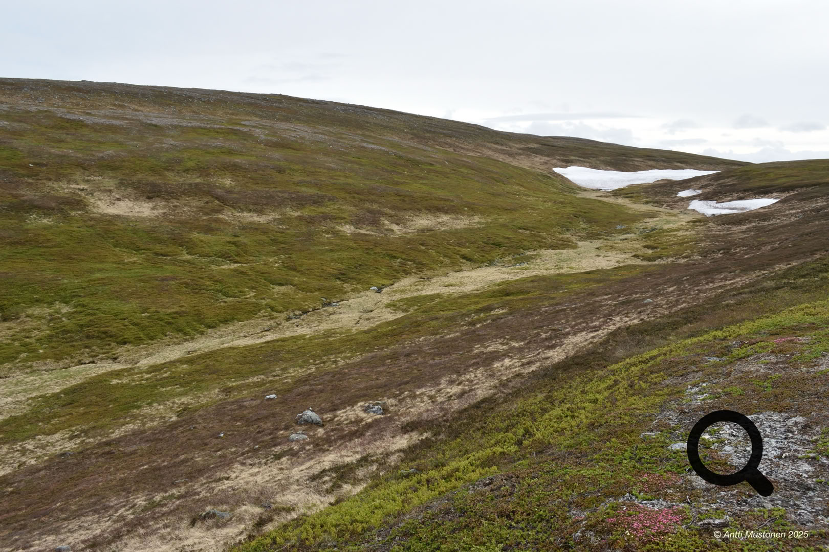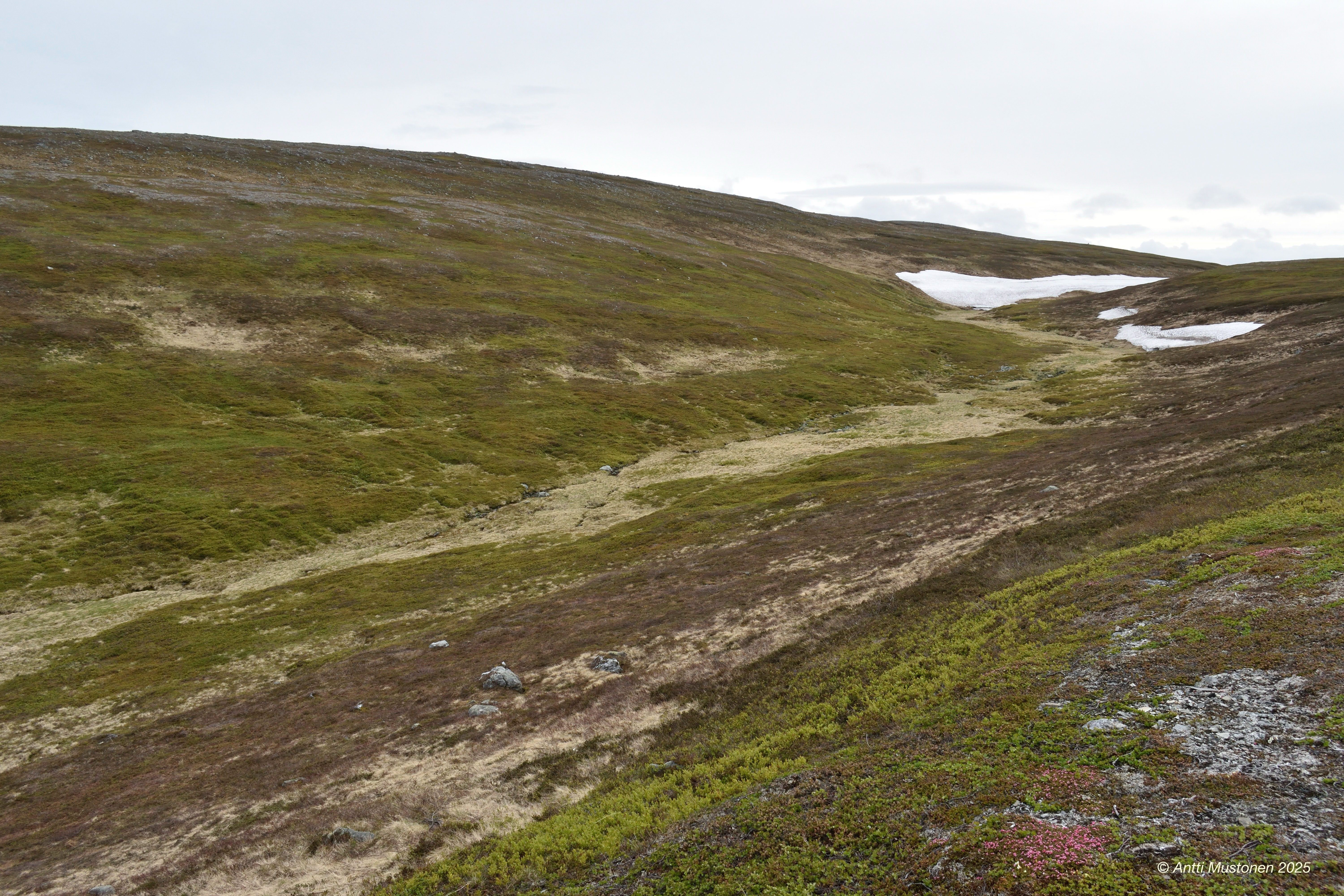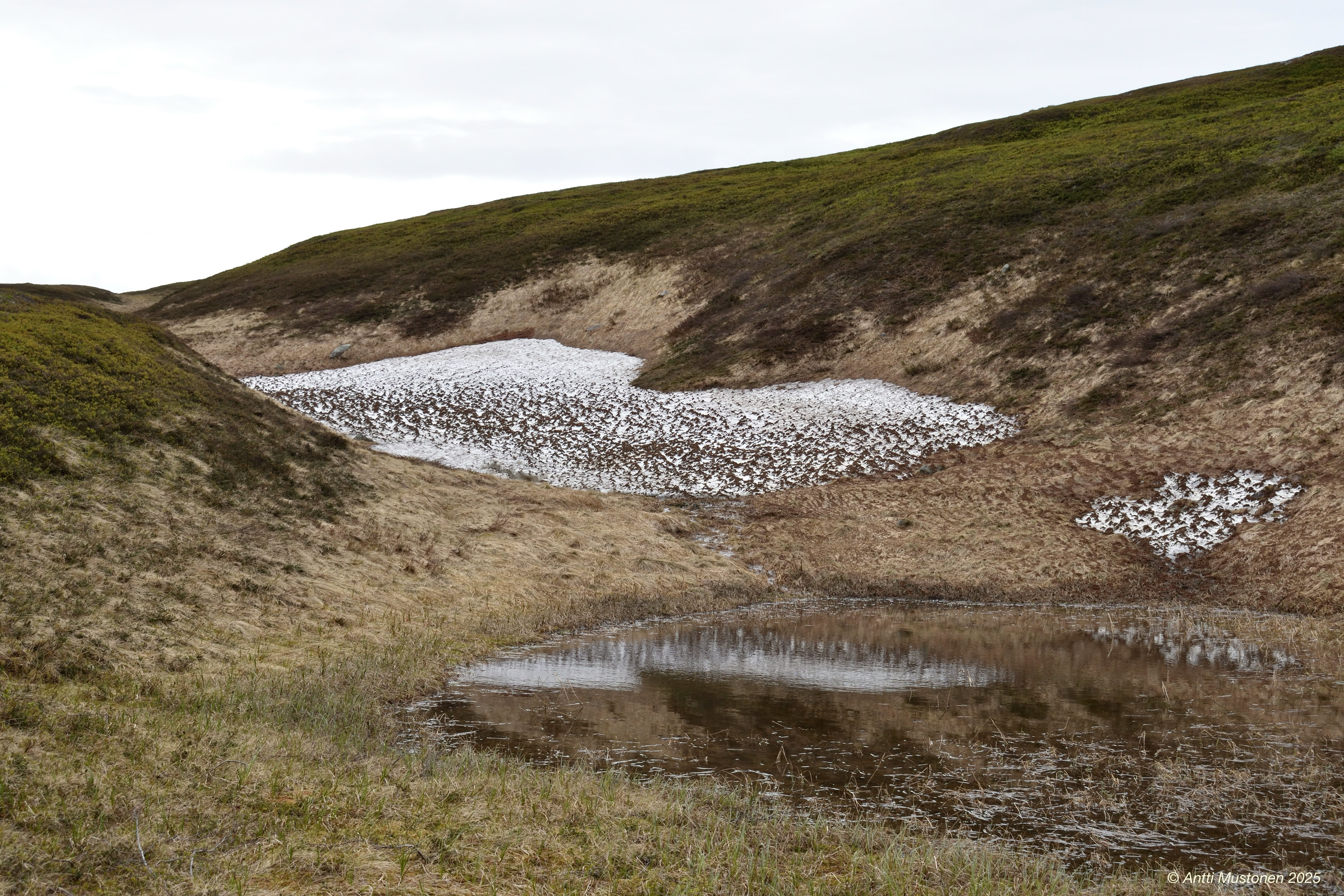 Jatkoimme matkaa ja koko ajan polku vei ylöspäin. Vajaan kilometrin päästä tulimme pieneen kuruun, josta löytyi lunta aivan polun läheltä sulamisvesilammikoineen. Toisena päivänä heinäkuuta.