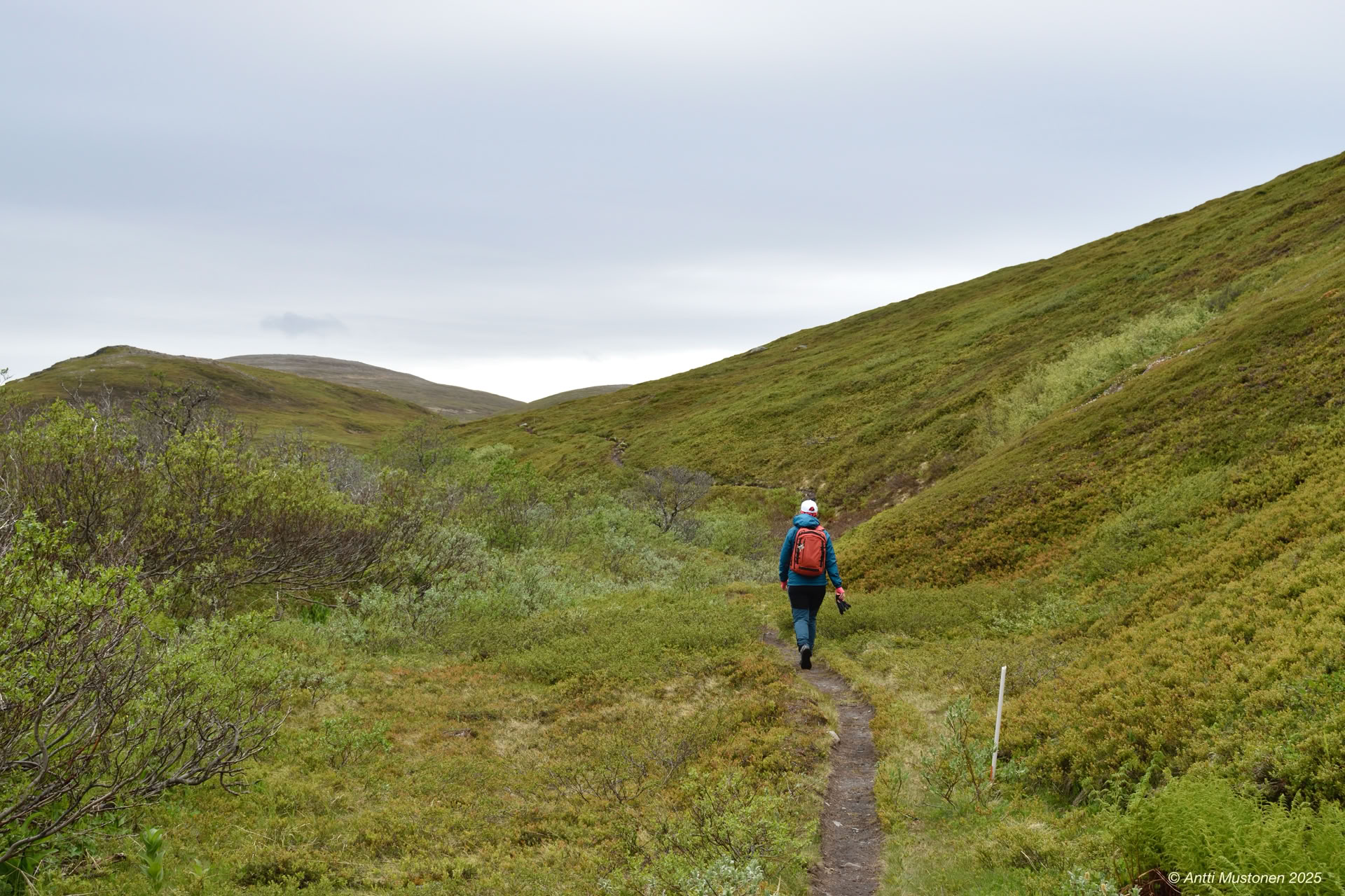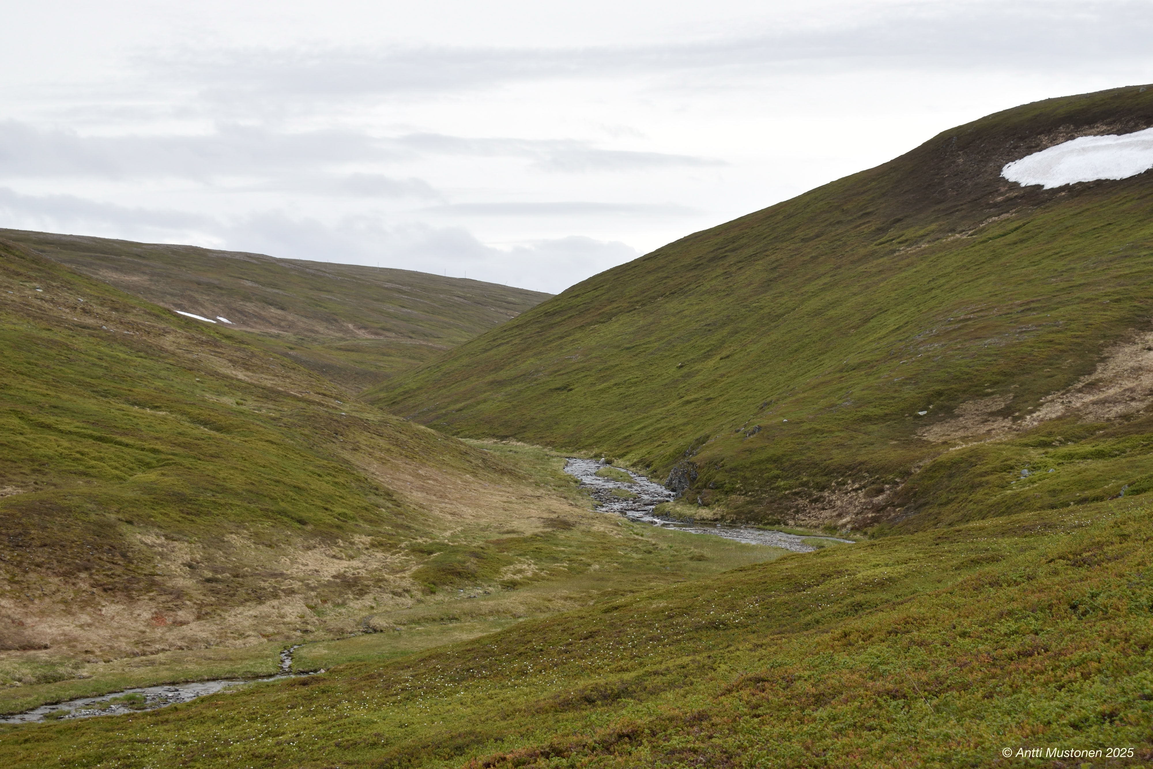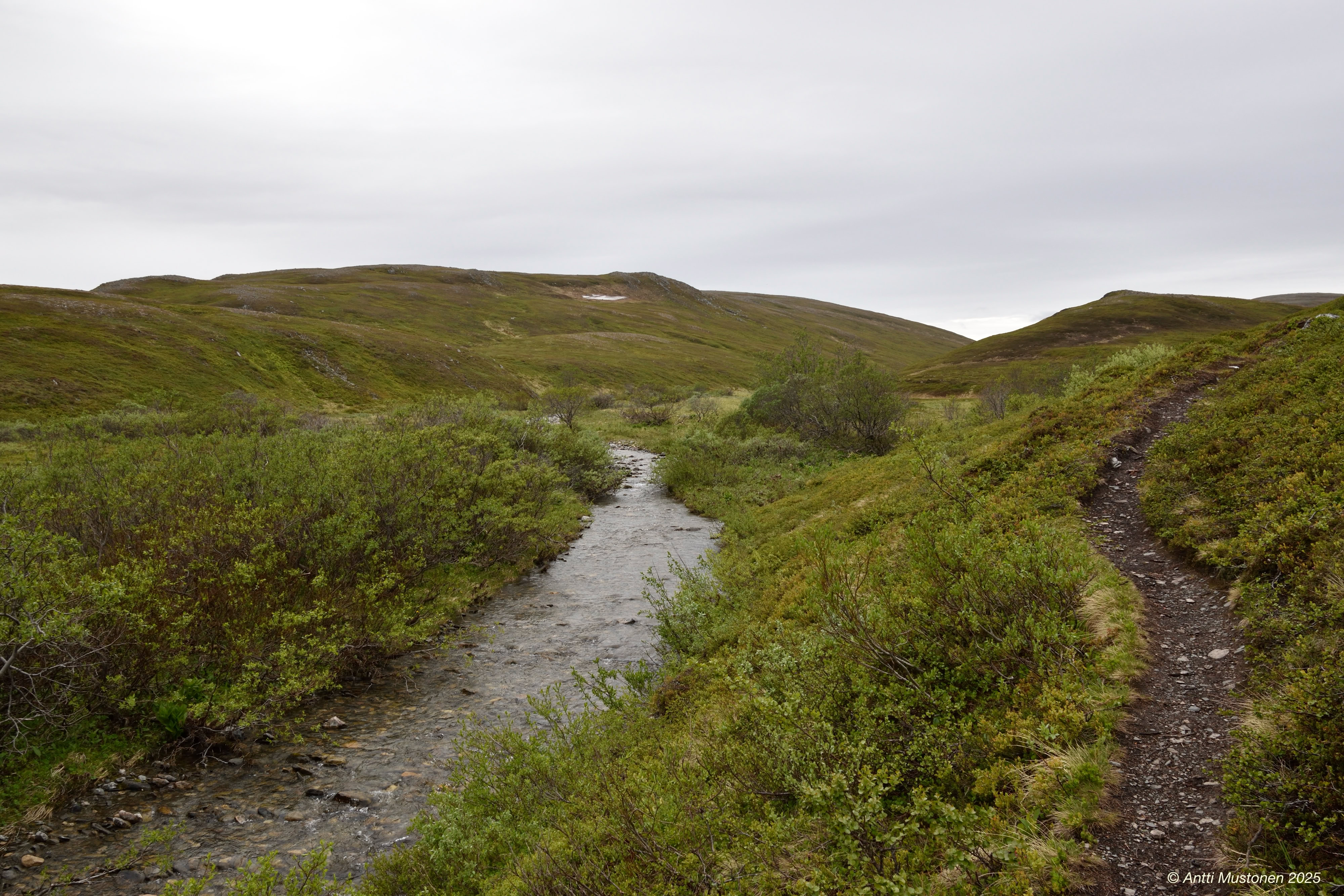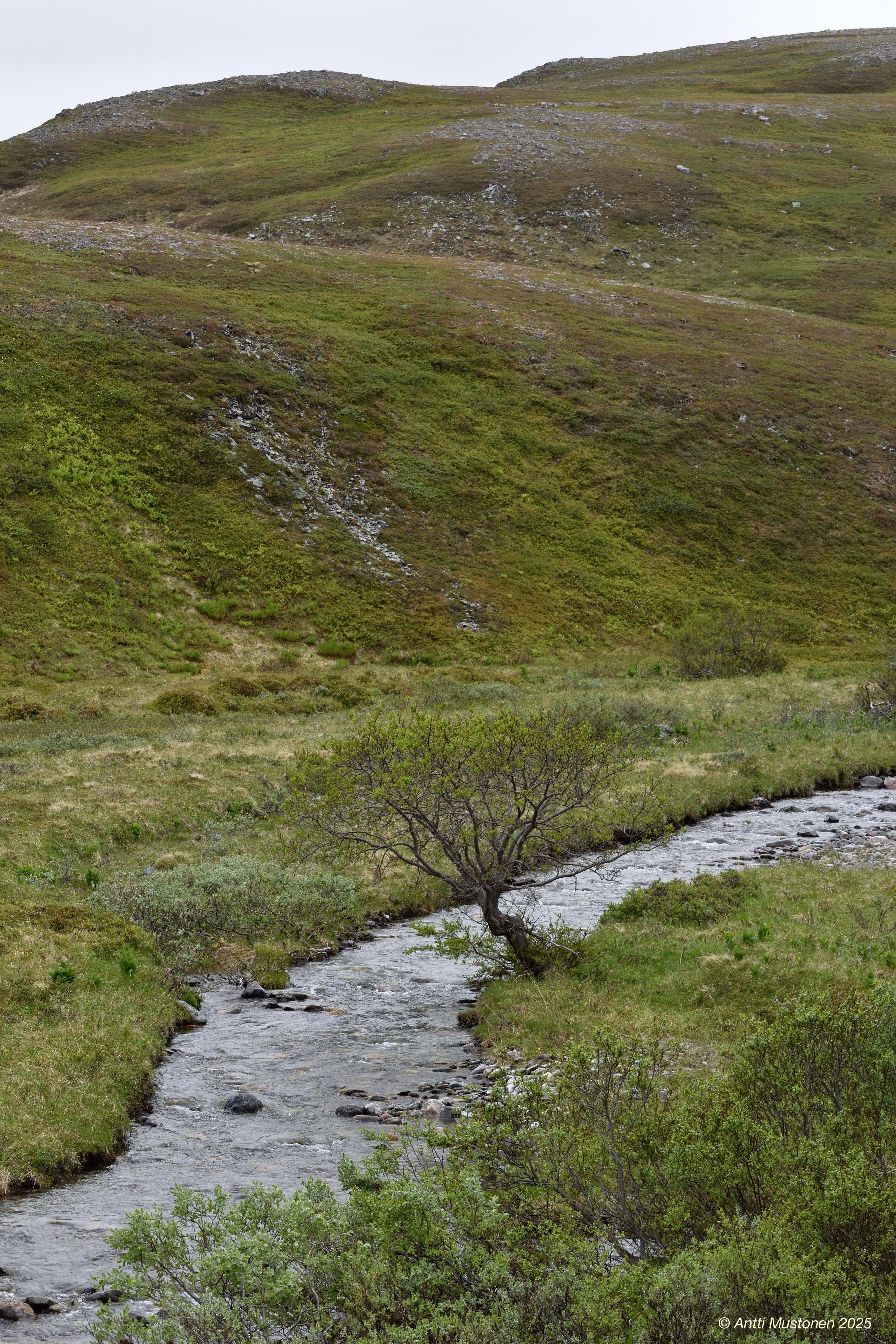 Muutama sata metriä lähtöpaikalta ja polku ylitti Bukkedalselva - nimisen puron. Puron liepeillä oli rehevämpää, ja puro virtasi pajujen lomassa alaspäin kohti suurempaa Skånsvikelvaa, joka puolestaan laskee mereen Berlevågin suunnassa.