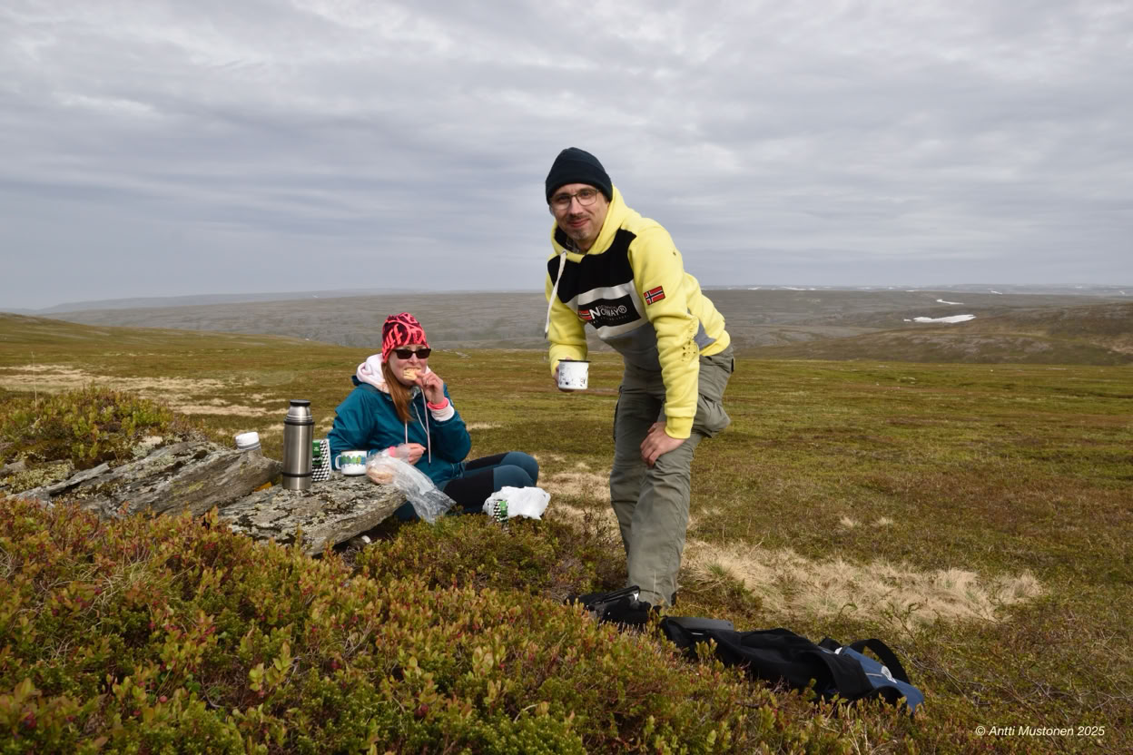 Niin se vaan oli kuitenkin maltettava lähteä, ja jättää tuo upea paikka taakse. Lähdimme laskeutumaan takaisin alaspäin, ja pian tulimme paikkaan, jossa ylhäällä vallitseva kivikko loppui ja varvikko alkoi. Poikkesimme polulta vähän sivuun, ja etsimme sopivan paikan syödä eväitämme, sekä hörpätä teetä termospullosta.