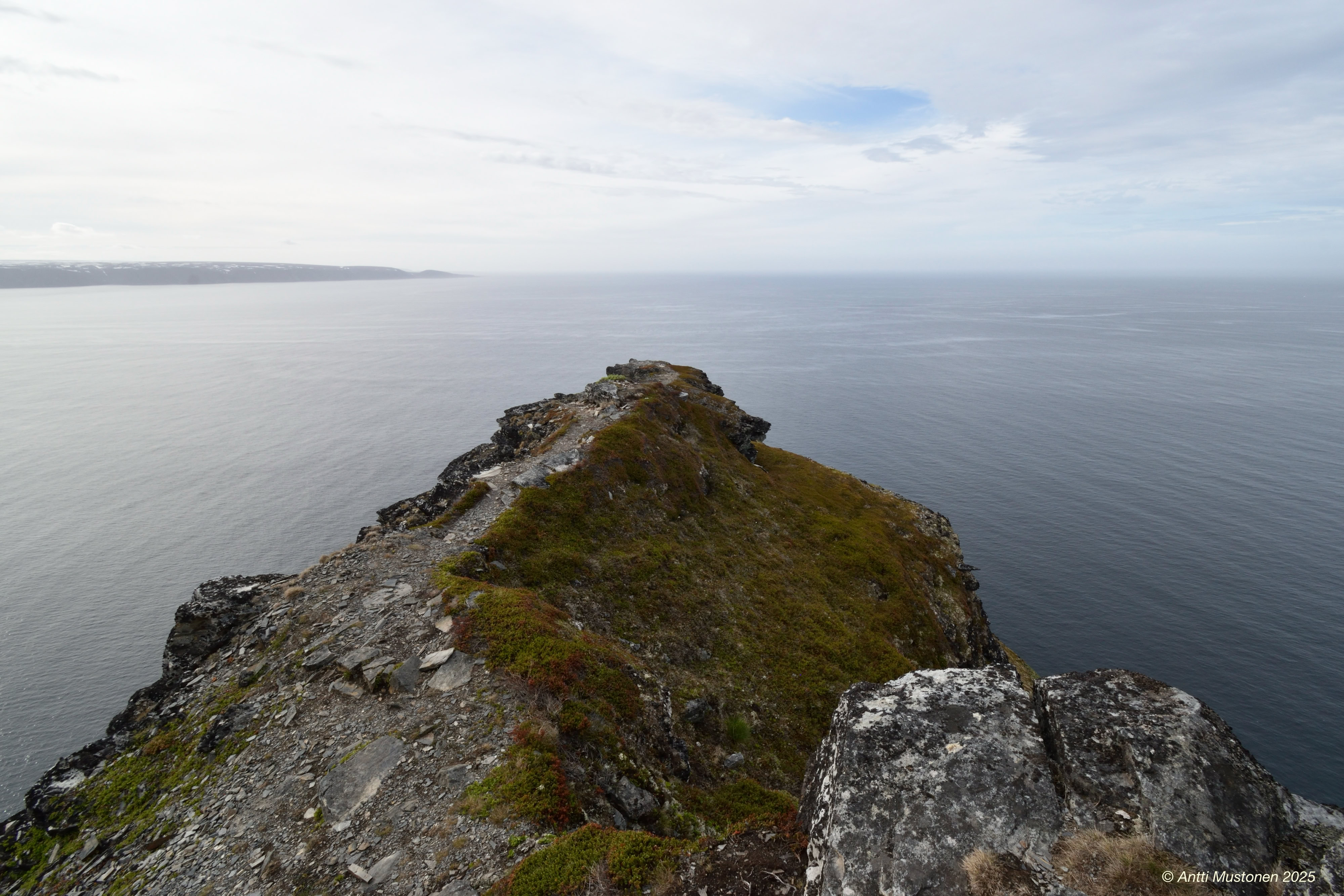 Huipulla oli hyvän kokoinen kivipino, jonka jälkeen edessä oli vielä kapea pitkähkö ulkonema eteenpäin suoraan pohjoiseen ja meren ylle. Tottumattomana tuollaisiin jyrkänteisiin Kainuulainen maalaisjärkeni sanoi minulle, että eteenpäin kivikasalta ei kannata enää mennä.