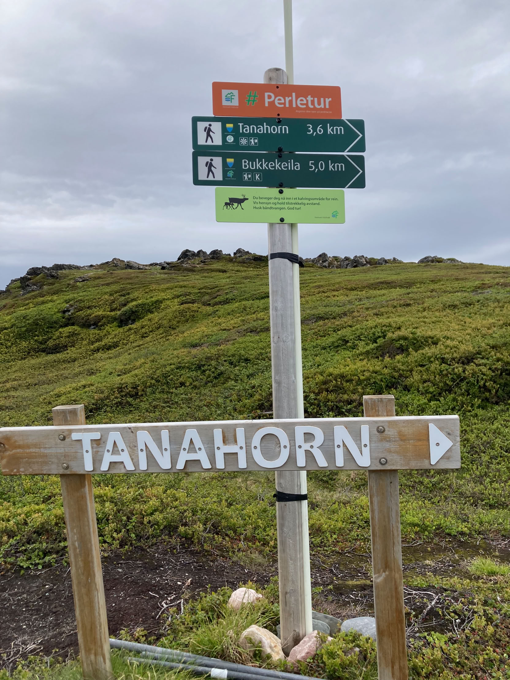 Kuten kuvasta näkyy, matkaa yhteen suuntaan kyltin mukaan Tanahornin huipulle on 3,6km. Siis lähelle saman pituinen kävely, kuin Saanan huipulle Kilpisjärven retkeilykeskuksesta.